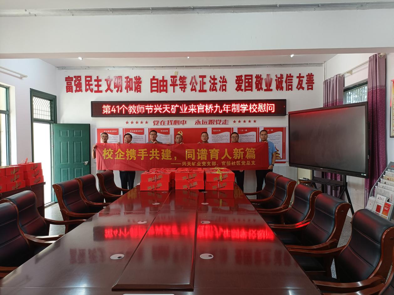 9月10日,興天礦業(yè)黨支部聯(lián)合官橋社區(qū)黨總支前往諭興九年制學校、官橋九年制學校,開展教師節(jié)慰問活動,向辛勤耕耘在教育一線的教師們致以節(jié)日問候和崇高敬意。