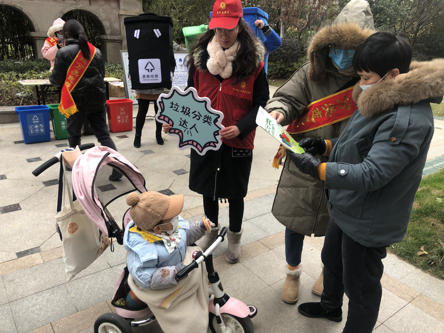 活動中,志愿者們身穿“可回收物”、“廚余垃圾”、“有害垃圾”、“其他垃圾”四色玩偶服,通過向居民發(fā)放宣傳單頁、開展“垃圾分分樂”、“垃圾分類跳棋”游戲等方式,向其宣傳垃圾分類相關知識。活動現(xiàn)場氣氛火熱,社區(qū)居民不畏嚴寒,紛紛從家中拿出廢舊電池、舊水銀溫度計等有害垃圾換取垃圾袋。