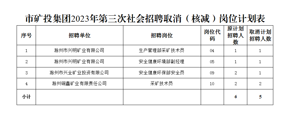 根據(jù)《滁州市興滁礦業(yè)投資集團有限公司2023年第三次社會招聘公告》規(guī)定,經(jīng)對各崗位報名情況篩查審定,結合資格復審情況,部分崗位報名情況未達到開考比例,經(jīng)研究決定取消(核減)以下崗位招聘計劃: