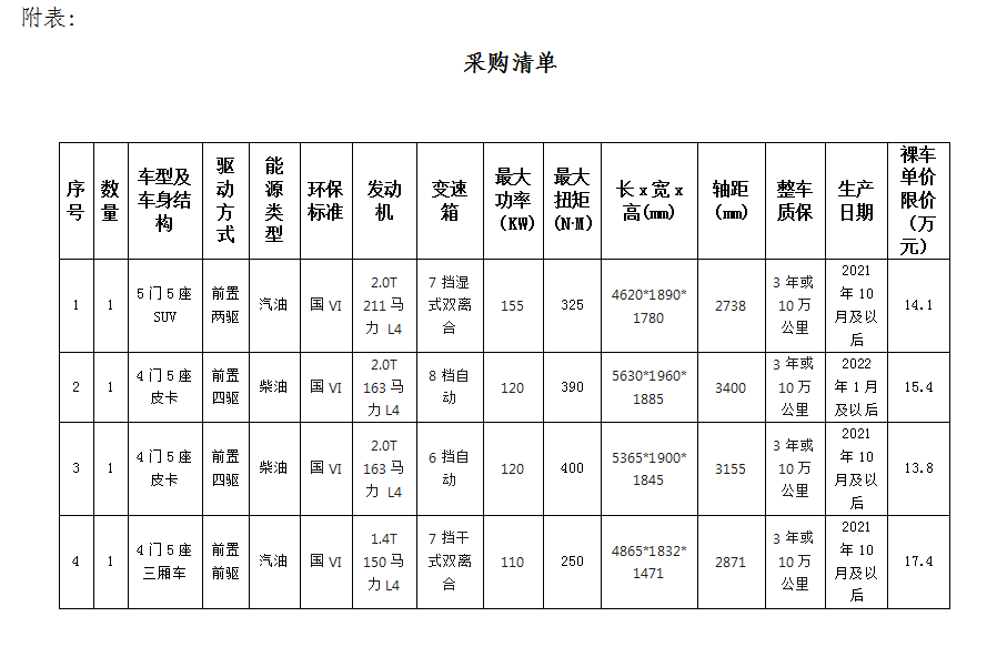 1.根據(jù)業(yè)務發(fā)展需要,滁州市興元商貿(mào)有限公司擬集中采購業(yè)務保障車輛共計4輛,詳情見附表。