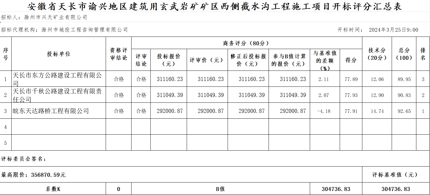 | 第三中標候選人 | 投標人名稱 | 天長市東方公路建設(shè)工程有限公司 | |