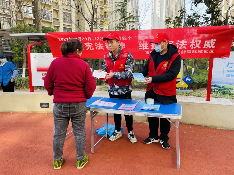 今年的憲法宣傳主題為“以習近平法治思想為指引,堅定不移走中國特色社會主義法治道路”。在社區(qū)法治小廣場,志愿者向居民發(fā)放憲法宣傳手冊,講解國家憲法的由來、地位、主要內容以及學習宣傳憲法的重要意義。